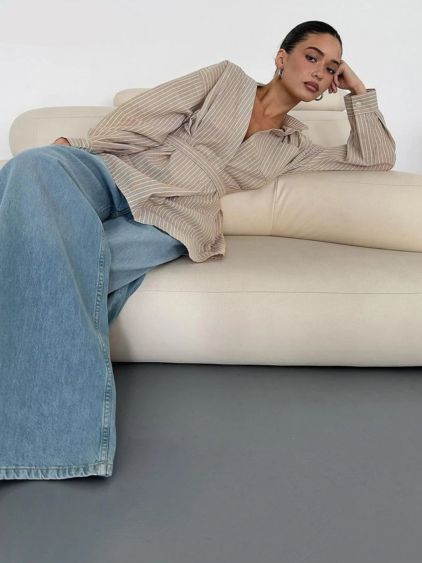 Oversized striped shirt in beige and white with a waist tie for a defined silhouette. Deep V neckline without collar, fluid cut, and long sleeves with structured cuffs. Ideal for styling loose with denim or cinched for an elegant touch.