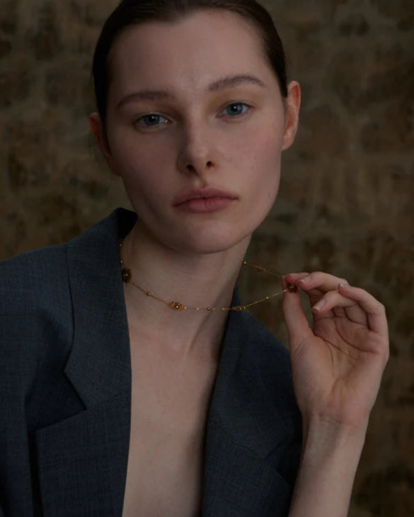 This floral-inspired necklace captures the essence of refined femininity. Crafted in stainless steel and finished with radiant 18k gold plating, it features dainty flower motifs arranged along a fine chain. A graceful piece that adds understated charm to both everyday outfits and elevated evening looks.