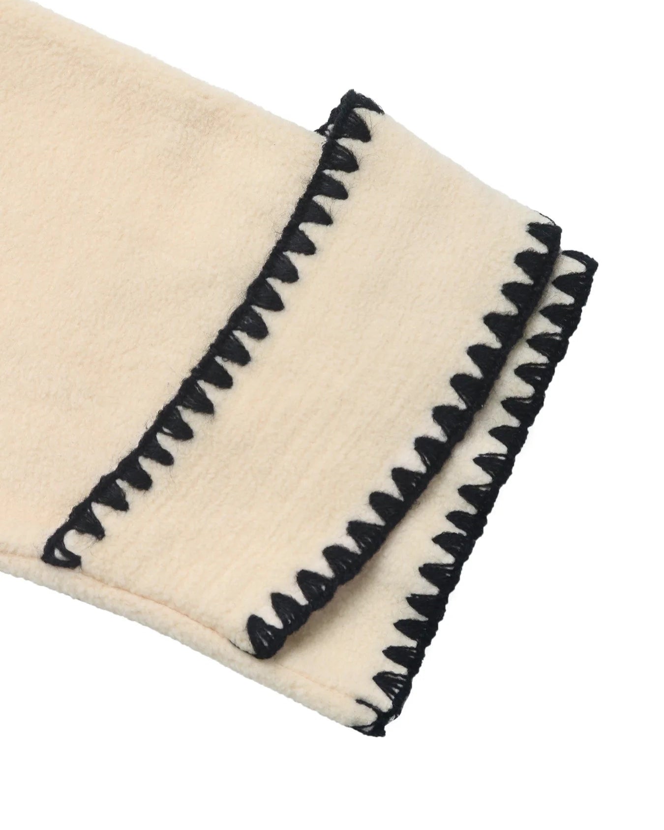 The Merveille Jacket features a clean beige tone elevated by sharp black contrast trims. Its straight cut drapes with ease, while marbled buttons add a subtle touch of sophistication. Versatile and elegant, it transitions seamlessly from casual days to polished evenings.