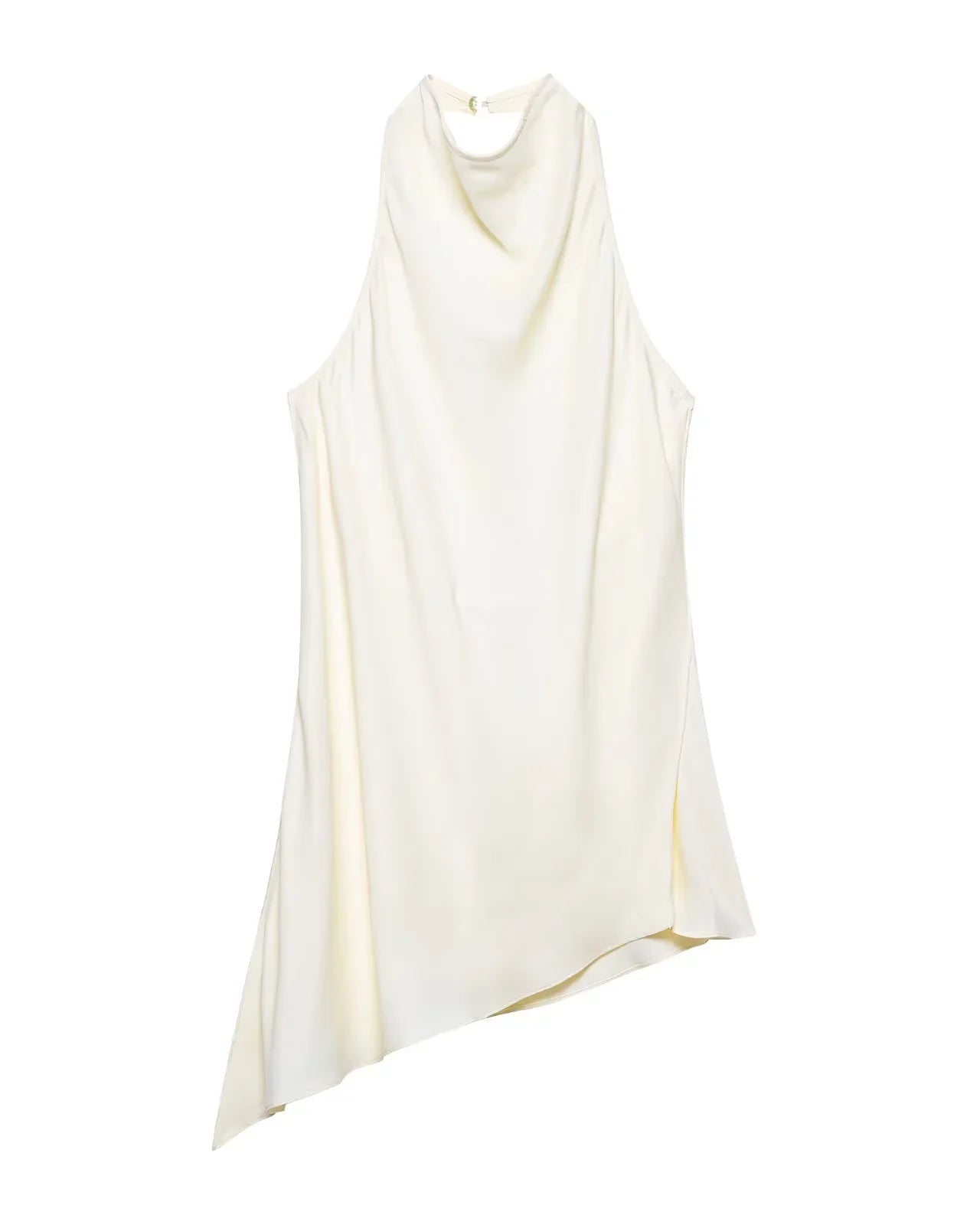 The Virtue co-ord set pairs a fluid halter top with asymmetric hem and tailored straight-leg trousers, both in an off-white satin-like fabric. The result is a clean, elongated silhouette that feels modern yet timeless — ideal for evenings where presence speaks louder than excess.